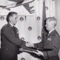 Col. Ivor Parry Evans, ex base commander of the Air Force Base at Roswell, New Mexico, and Major General Douglas Nelson, ex commander of Area 51, shaking hands.